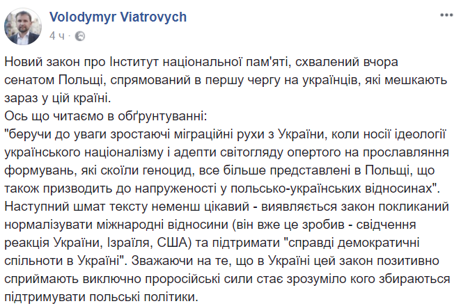 "Новый закон об Институте национальной памяти, одобренный вчера Сенатом Польши, направлен в первую очередь на украинцев, проживающих сейчас в этой стране.