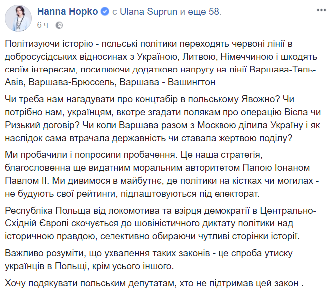"Республика Польша от локомотива и образца демократии в Центральной и Восточной Европе скатывается к шовинистическому диктату политики над исторической правдой, селективно выбирая чувствительные страницы истории", – написала Гопко в Facebook.