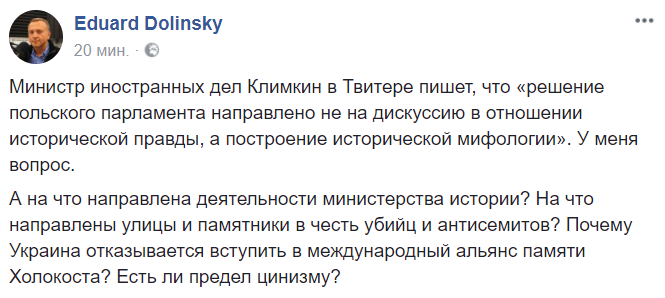 "Министр иностранных дел Климкин в Твиттере пишет, что "решение польского парламента направлено не на дискуссию в отношении исторической правды, а на построение исторической мифологии". У меня вопрос.
