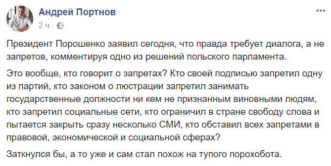 Заткнулся бы, а то уже и сам стал похож на тупого порохобота", – комментирует юрист Андрей Портнов.