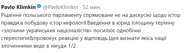 "Решение польского парламента направлено не на дискуссию по исторической правде, а на построение исторической мифологии. Введение в юридическую плоскость термина "преступления украинских националистов" усиливает односторонние стереотипы и провоцирует ответную реакцию. Идея признать какие-то нации преступными ведет в никуда", – написал Климкин в Twitter.