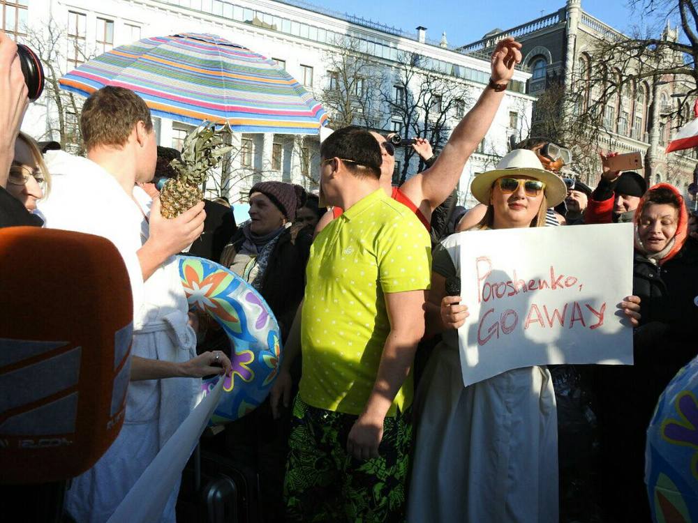 Участники оригинальной акции таким необычным образом вновь привлекли внимание к отдыху президента на Мальдивах. Многие участники даже разоблачились до купальных костюмов, другие же держали в руках ананасы и плакаты с надписью "Poroshenko go away".