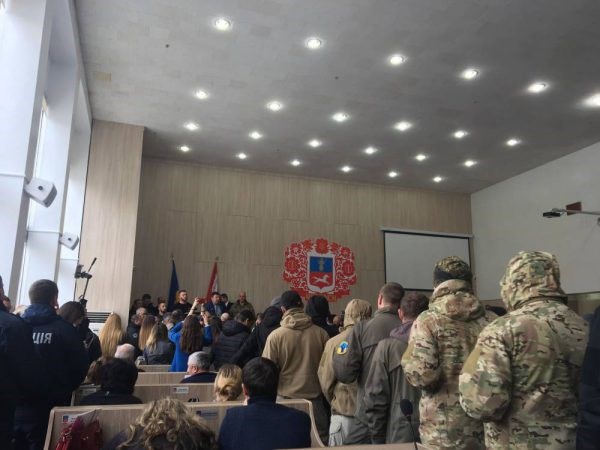 "В начале сессии в зал вошла группа молодчиков в серо-черных формах с надписями "Национальная дружина" и черных формах со значками Национального корпуса "Азов". Все они были замотаны шарфами или в балаклавах с капюшонами, а также с явными признаками того, что у них есть оружие (они зашли с такими сумками, которые предназначены для скрытого ношения оружия). Они стали между рядами, забрались на трибуну, а их лидер Дмитрий Кухарчук и бывший заместитель мэра Анатолия Бондаренко – Геннадий Шевченко – вместе с некоторыми АТОшниками, заблокировали трибуну. При этом Кухарчук выкрикнул на весь зал: "Депутатов не выпускать". Вот так началась сессия", – рассказал в комментарии "Обозревателю" депутат Черкасского горсовета Александр Згиблов.