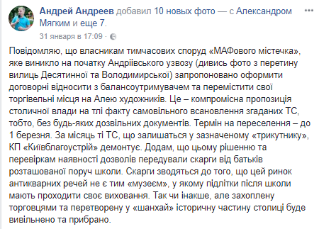 "Добавлю, что этому решению и проверкам наличия разрешений предшествовали жалобы от родителей расположенной рядом школы. Жалобы сводятся к тому, что этот рынок антикварных вещей не является тем "музеем", в котором подростки после школы должны проходить свое воспитание. Так или иначе, но захваченную торговцами и превращенную в "шанхай" историческую часть столицы освободят и уберут", - написал он.
