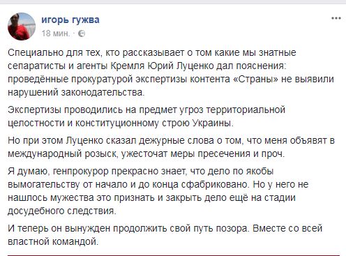 Главный редактор "Страны" Игорь Гужва, который был вынужден просить политическое убежище в Австрии, на своей странице в Facebook прокомментировал заявление генпрокурора Юрия Луценко в свой адрес.