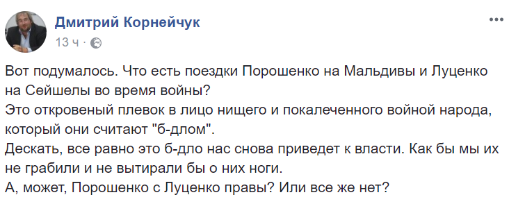 На своей странице в Facebook Середюк пояснил, что "человек похожий на него" толкнул Резниченко из-за его комментария по поводу ареста одного из поджигателей Десятинного монастыря Алексея Шемотюка. Середюк выложил скрин поста Резниченко.