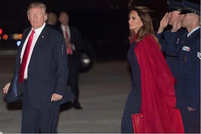 Издание отмечает, что Мелания выбрала образ в патриотических цветах: темно синие скинни-джинсы и вишневый плащ первая леди дополнила парой Лабутенов.