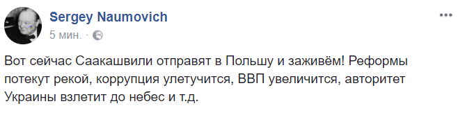 16:16 "Вот сейчас Саакашвили отправят в Польшу и заживём! Реформы потекут рекой, коррупция улетучится, ВВП увеличится, авторитет Украины взлетит до небес и т.д.", - иронизирует блогер Сергей Наумович.