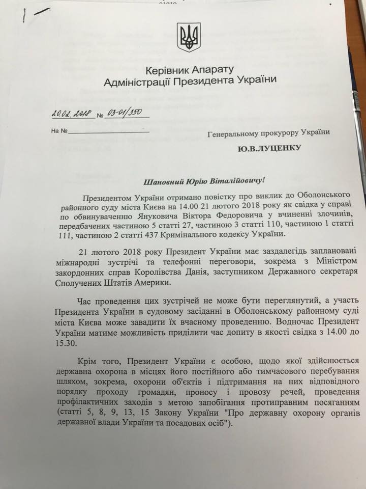 Порошенко передумал ехать в суд по делу Януковича. Хочет дать показания по скайпу. Документ