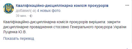 Квалификационно-дисциплинарная комиссия прокуроров решила закрыть дисциплинарное производство в отношении Генпрокурора Юрия Луценко.