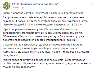 В четверг, 1 марта, в Киеве ожидается осложнение погодных условий. Об этом сообщает Киевская служба спасения на странице в Facebook.