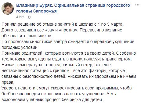 "Принял решение об отмене занятий в школах с 1 по 3 марта", - написал мэр.