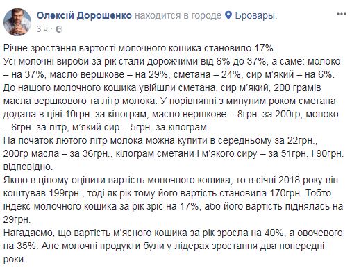 Дорошенко сообщает, что на начало февраля литр молока можно было купить в среднем за 22 гривны, 200 грамм масла - за 36 гривен, килограмм сметаны - за 51 гривну, килограмм мягкого сыра - за 90 гривен.
