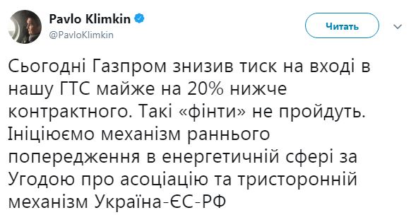 "Сегодня "Газпром" снизил давление на входе в нашу ГТС почти на 20% ниже контрактного. Такие "финты" не пройдут", - написал Климкин.