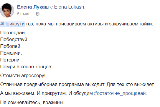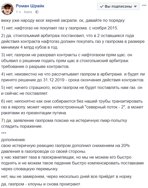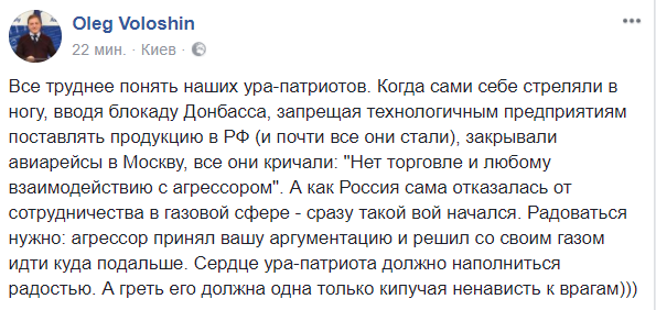"Все труднее понять наших ура-патриотов. Когда сами себе стреляли в ногу, вводя блокаду Донбасса, запрещая технологичным предприятиям поставлять продукцию в РФ (и почти все они стали), закрывали авиарейсы в Москву, все они кричали: "Нет торговле и любому взаимодействию с агрессором". А как Россия сама отказалась от сотрудничества в газовой сфере – сразу такой вой начался. Радоваться нужно: агрессор принял вашу аргументацию и решил со своим газом идти куда подальше. Сердце ура-патриота должно наполниться радостью. А греть его должна одна только кипучая ненависть к врагам)))".