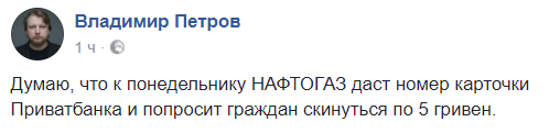"Думаю, что к понедельнику "Нафтогаз" даст номер карточки ПриватБанка и попросит граждан скинуться по 5 гривен", – иронизирует шоумен Владимир Петров.