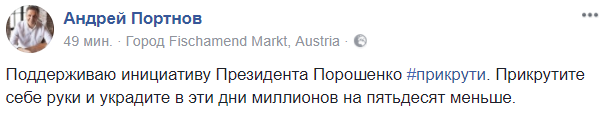 "Поддерживаю инициативу Президента Порошенко #прикрути. Прикрутите себе руки и украдите в эти дни миллионов на пятьдесят меньше", – советует властям юрист Андрей Портнов.