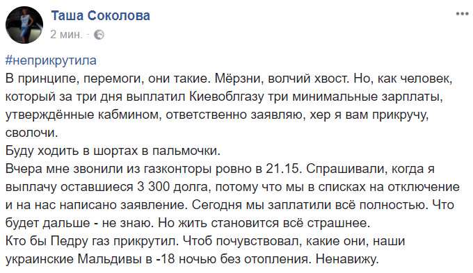 Кто бы Педру газ прикрутил. Чтоб почувствовал, какие они, наши украинские Мальдивы в -18 ночью без отопления. Ненавижу".