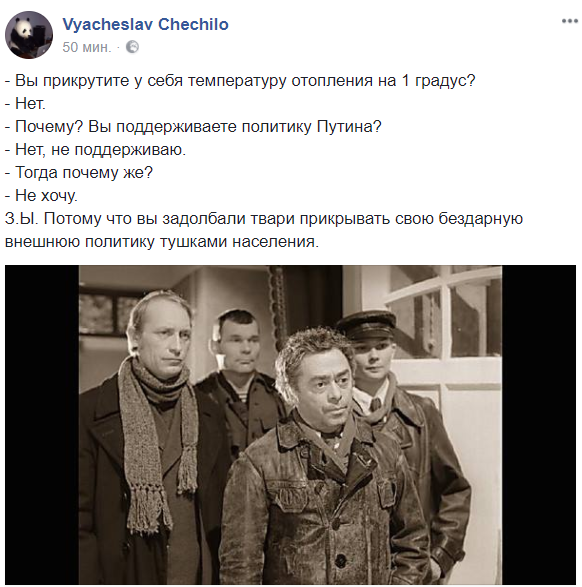 "Прежде чем выключать батареи, хотелось бы таки знать, что же именно нам продают взамен на холодную квартиру, социально-экономическую деградацию и войну. Петр Алексеевич, уточните плз", – пишет журналист.