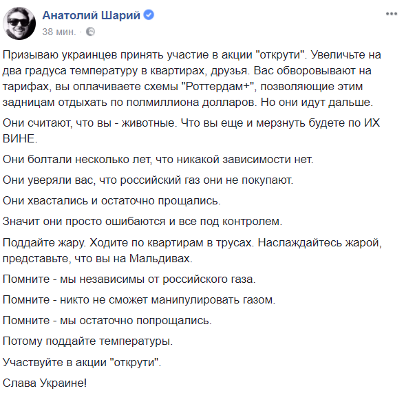 Поддайте жару. Ходите по квартирам в трусах. Наслаждайтесь жарой, представьте, что вы на Мальдивах. Помните – мы независимы от российского газа", – пишет Шарий.