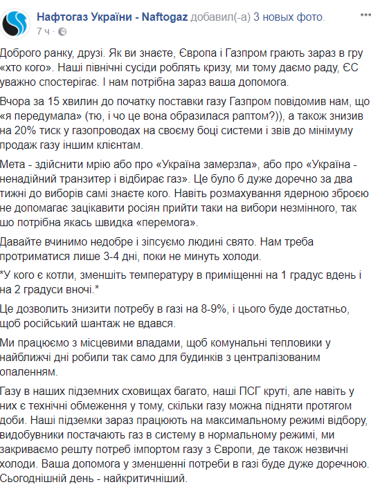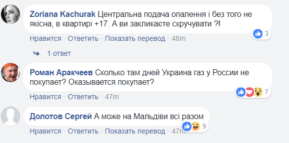 В комментариях к посту "Нафтогаза" многие пользователи раскритиковали инициативу компании. Говорят, что во многих домах и так холодно. И удивляются, что Украина, оказывается, покупает газ у России (точнее, хотела купить) – хотя власти два года говорили об обратном.
