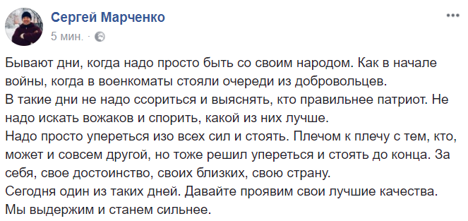Президента поддержали некоторые блогеры. Так, айтишник Сергей Марченко считает, что нужно "сплотиться и стать сильнее".