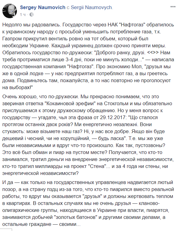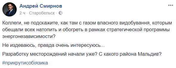 "Коллеги, не подскажете, как там с газом власного видобування, которым обещали всех натопить и обогреть в рамках стратегической программы энергонезависимости? Не издеваюсь, правда очень интересуюсь...