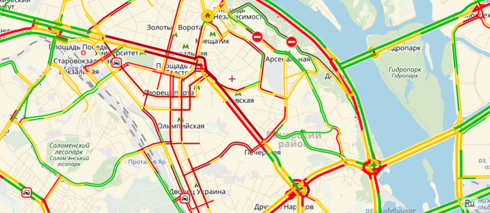 Движение затруднено у станций метро "Дружбы народов", "Лыбидская", "Дворец Украина", "Олимпийская", "Университет", "Театральная", "Золотые ворота", "Кловская", "Майдан Незалежности", "Крещатик", "Контрактовая площадь", "Почтовая площадь".
