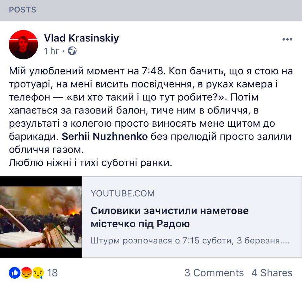 "В частности, против корреспондента "Радио Свобода" Сергея Нужненко применен газовый баллончик, журналиста "ГромадськеТБ" Богдана Кутепова ударили ногой. А репортера издания "Инсайдер" Красинского грубо выталкивают щитами с места происшествия", - пишет он.
