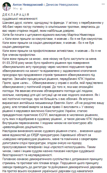 "Следствием вынесенного мной судебного решения стало... внесение в отношении меня сведений в ЕРДР прокуратурой Харьковской области за "заведомо неправосудное решение", меня и помощника с секретарем допрашивали следователи прокуратуры, вскоре ожидаю подозрение, прослушку телефонов и другие "прелести непослушания". Таким образом, и мне, и другим судьям, наглядно показаны последствия суддейской беспристрастности и непредвзятости", - заявил Невядомский.