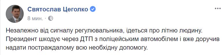 "Независимо от сигнала регулировщика, речь идет о пожилого человека. Президент сожалеет о ДТП с полицейским автомобилем и уже поручил оказать пострадавшему всю необходимую помощь", - написал Цеголко.