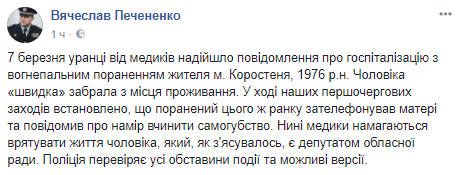Депутат Житомирского областного совета в Коростене пытался покончить жизнь самоубийством. Об этом сообщил начальник Нацполиции в Житомирской области Вячеслав Печененко на своей странице в Facebook.