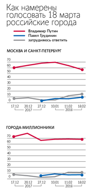 Аналогичные тренды в городах с населением от 100 000 до 500 000 человек и до 100 000 человек, а стабильным рейтинг президента остается лишь в городах с 500 000–950 000 жителей и на селе. При этом в крупных городах увеличилось число не определившихся с выбором и подрос рейтинг кандидата от КПРФ Павла Грудинина.