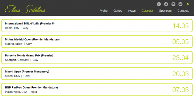 Элина после американских турниров планирует на месяц взять перерыв и дальше выступить в Штутгарте (с 23 апреля), Мадриде (5-13 мая) и Риме (14-20 мая).