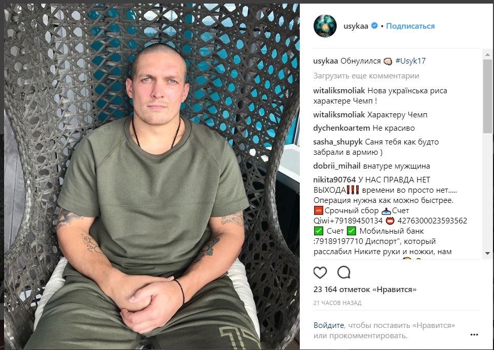 Украинский тяжеловес Александр Усик постригся под ноль. Фото своего нового образа он опубликовал на странице в Instagram.