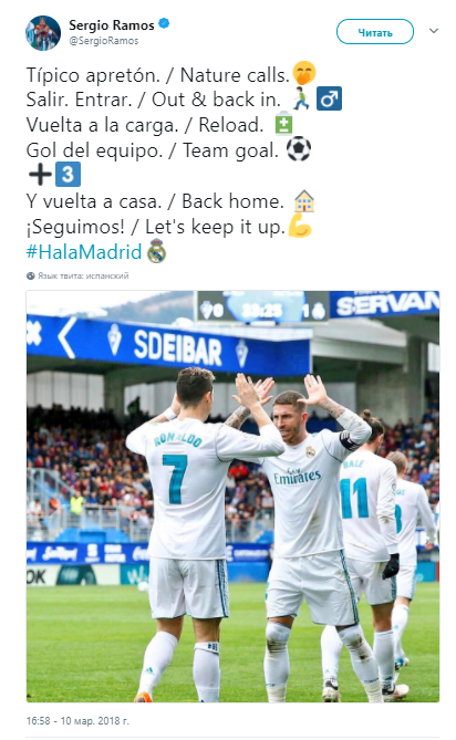 В матче 28 тура Ла-Лиги Эйбар принимал мадридский Реал. И во время матча произошел досадный инцидент, когда капитан "галактикос" Серхио Рамос убежал с поля в подтрибунные помещения. Как выяснилось позже причина у капитана Реала была более чем уважительная - приступ диареи.