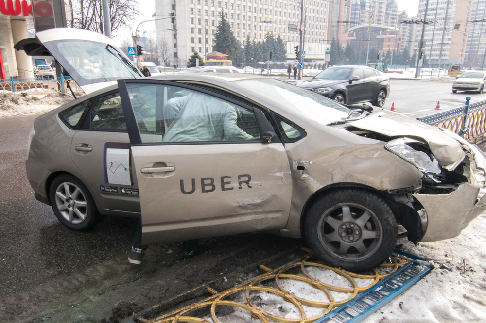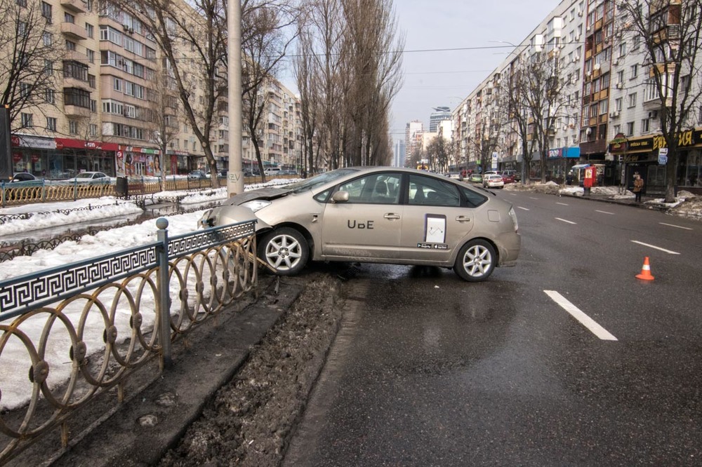 Сегодня в Киеве на бульваре Леси Украинки, возле метро Печерская, произошло ДТП. Toyota Prius службы такси Uber врезалась в ограждение. Об этом сообщает "Информатор".