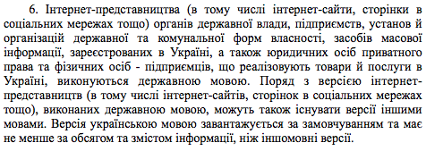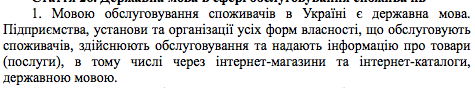 4. Бытовой сферы – после принятия законопроекта предприятия и организации всех форм собственности, которые работают с клиентами и потребителями, должны осуществлять обслуживание на украинском языке. Причем это правило распространяется и на интернет-магазины и торговлю через интернет-каталоги. А обслуживание на иных языках может происходить исключительно по просьбе клиентов. Любые маркировки также должны будут стать доступны на украинском языке, причем шрифтом не менее, чем тот, что используется в маркировках и этикетках на языке оригинала.