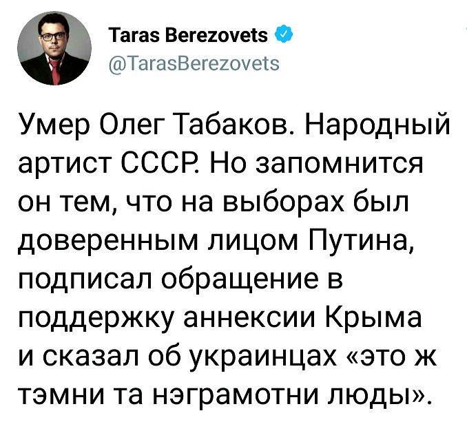 Политолог Тарас Березовец заявил, что Табаков запомнится лишь тем, что поддерживал Путина, аннексию Крыма и называл украинцев "неграмотными людьми".