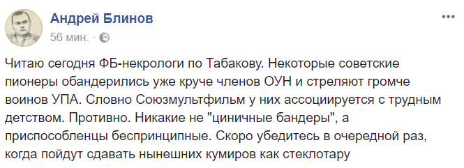 "Читаю сегодня ФБ-некрологи по Табакову. Некоторые советские пионеры обандерились уже круче членов ОУН и стреляют громче воинов УПА. Словно Союзмультфильм у них ассоциируется с трудным детством. Противно. Никакие не "циничные бандеры", а приспособленцы беспринципные. Скоро убедитесь в очередной раз, когда пойдут сдавать нынешних кумиров, как стеклотару".