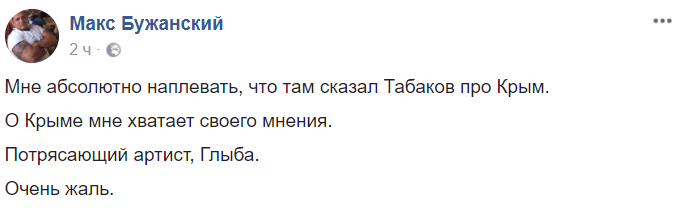 "Мне абсолютно наплевать, что там сказал Табаков про Крым. О Крыме мне хватает своего мнения. Потрясающий артист, Глыба. Очень жаль", – пишет блогер Макс Бужанский.