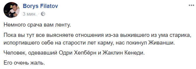 Мэр Днепра Борис Филатов назвал Табакова "выжившим из ума стариком" и призвал горевать по умершему модельеру Живанши.