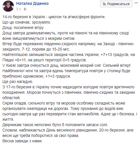 "Самой теплой остается западная часть Украины, +7+13 градусов, на Юге +6+11, на остальной территории 0+5 градусов. В Киеве завтра ожидается дождь, возможен мокрый снег. Сильный ветер! Ближайшей ночью и завтра днем температура воздуха в столице будет примерно одинаковой, +1+3 градуса", – написала в соцсети синоптик и напомнила, что с 17-го марта в Украину начнет поступать холодный воздух арктического происхождения.