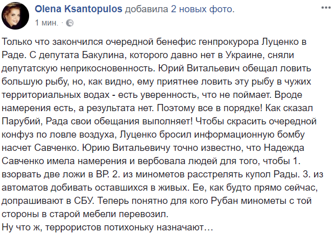 "Чтобы скрасить очередной конфуз по ловле воздуха, Луценко бросил информационную бомбу насчет Савченко. Юрию Витальевичу точно известно, что Надежда Савченко имела намерения и вербовала людей для того, чтобы 1. взорвать две ложи в ВР. 2. из минометов расстрелять купол Рады. 3. из автоматов добивать оставшихся в живых. Ее, как будто прямо сейчас, допрашивают в СБУ. Теперь понятно для кого Рубан минометы с той стороны в старой мебели перевозил.