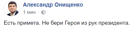 11:51  "Есть примета. Не бери Героя из рук президента", - пишет нардеп Александр Онищенко.