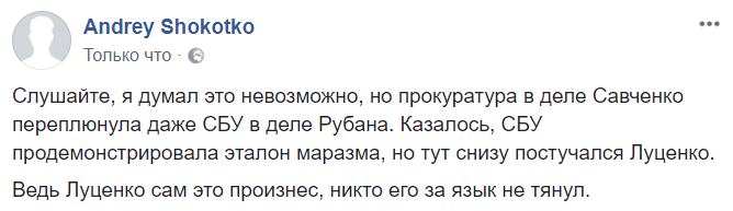 12:50  "Слушайте, я думал это невозможно, но прокуратура в деле Савченко переплюнула даже СБУ в деле Рубана. Казалось, СБУ продемонстрировала эталон маразма, но тут снизу постучался Луценко.