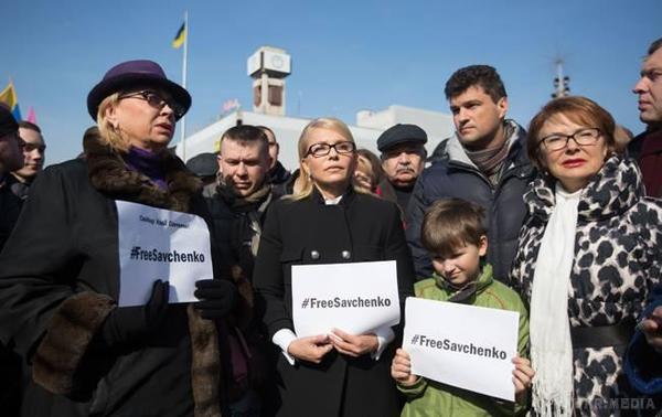 Юлия Тимошенко, которая включила находящуюся в тюрьме Савченко в избирательный список своей партии, держала плакат #FreeSavchenko на митинге в марте 2016 года.  Компанию ей составила Александра Кужель.