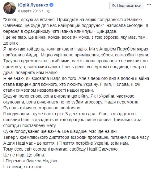"С первого дня плена война Надежда Савченко стала образцом для каждого. Я не знаю, как воевала Надя раньше. Но с первого дня в плену ее война стала образцом для каждого, кто любит Украину. Ее имя, ее слова, ее глаза стали символом непреодолимости нашей страны. Будучи пленной, она выиграла эту войну. Как и Украина, частично оккупирована, она оказалась не по зубам агрессору. Надежда победила Путина - физически, морально, политически", - заявлял раньше Генеральный прокурор Юрий Луценко.