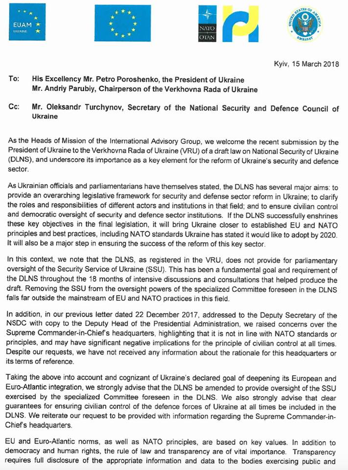В документе говорится, что законопроект "О национальной безопасности Украины" не предусматривает парламентского контроля за деятельностью Службы безопасности Украины (СБУ), что является одним из фундаментальных требований по приближению к НАТО. Администрация Президента и СБУ 18 месяцев работали с представителями НАТО и ЕС над документом в этой сфере, но в конце концов полностью проигнорировали эти обязательства.