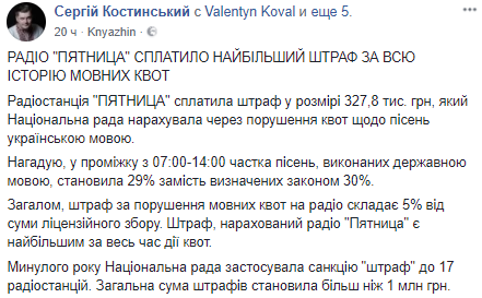 "В общем, штраф за нарушение языковых квот на радио составляет 5% от суммы лицензионного сбора. Штраф, начисленный радио "Пятница", является крупнейшим за все время действия квот", - написал Костинский.